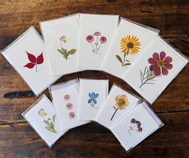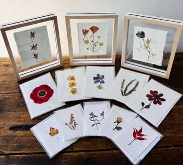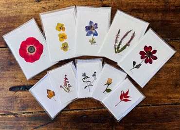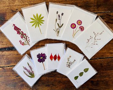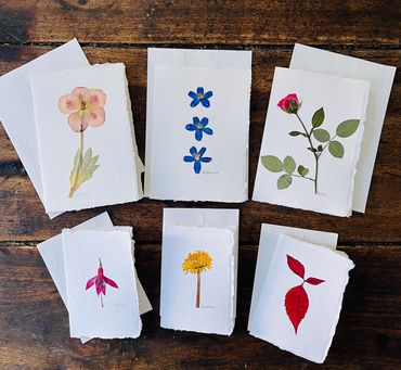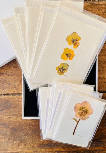 Real pressed flowers mounted on handmade cotton greeting cards with deckled edges & matching envelopes.